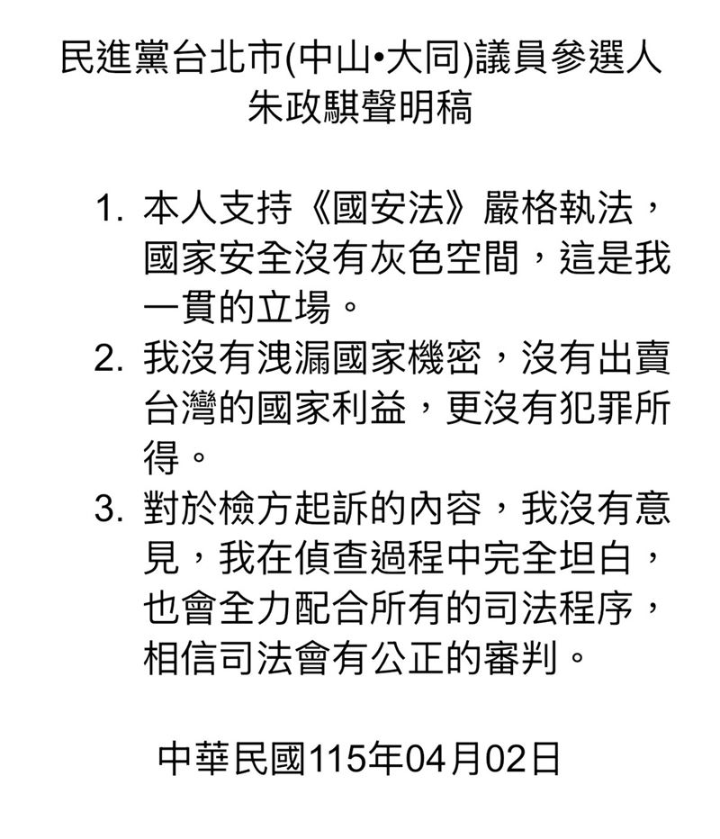 民進黨台北市議員參選人朱政騏才剛通過黨內初選,卻爆出涉入共諜案。台北地檢署查出,朱政騏涉嫌利用擔任立委何志偉特助機會,偷拍機密文件傳送給中國籍人士,收受人民幣2萬元報酬,今(2)日依照違反《國家安全法》洩密罪起訴。對此,朱政騏稍早回應,強調自己沒有洩漏國家機密,也支持《國安法》嚴格執法,「國家安全沒有灰色空間,這是我一貫的立場。」對於檢方起訴內容沒有意見,會全力配合所有司法程序,相信司法有公正審判。