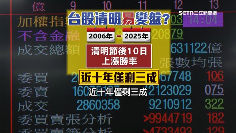 透過數據觀察逐年回測2006至2025年台股表現,清明節後10日上漲勝率近十年僅剩三成,是所有節慶中警示訊號最強的時刻,2026又加上了川普變數情況似乎更加難測。