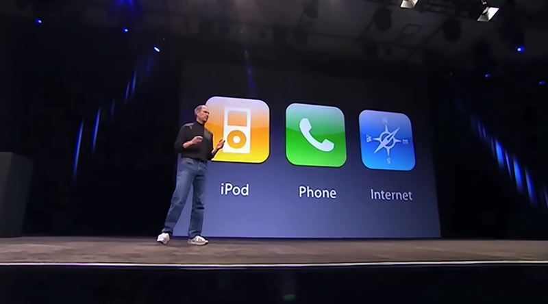 一台裝置改變世界 全場瞬間陷入瘋狂「一台iPod,一支電話,一個網路通訊器,」賈伯斯調皮的重複著:「一台iPod……一支電話……你們聽懂了嗎?這不是三個獨立的裝置!」觀眾終於恍然大悟,全場瞬間陷入瘋狂。「這是一個裝置!我們叫它iPhone。」