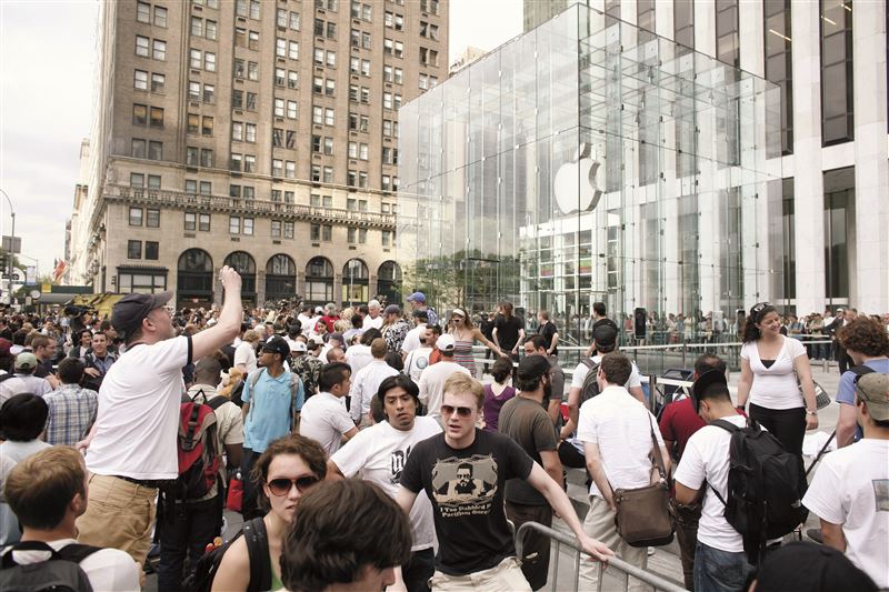 全球排隊搶購「耶穌手機」 果粉搭帳篷夜宿門市2007 年6 月29 日,經過半年令人屏息的期待,開賣日終於到來。iPhone 的平面報導已經多達一萬一千篇,Google 搜尋紀錄則有六千九百萬次。發售前一週,果粉已經在蘋果與AT&T門市外搭帳蓬,希望能搶先入手這款被奉為「耶穌手機」的神機。賈伯斯、艾夫和佛斯托爾到一家蘋果直營店視察消費者。隔天晚上,他們在舊金山藝術宮為所有參與iPhone 研發的人員及其家屬舉辦慶功宴,蘿琳也陪同賈伯斯出席。