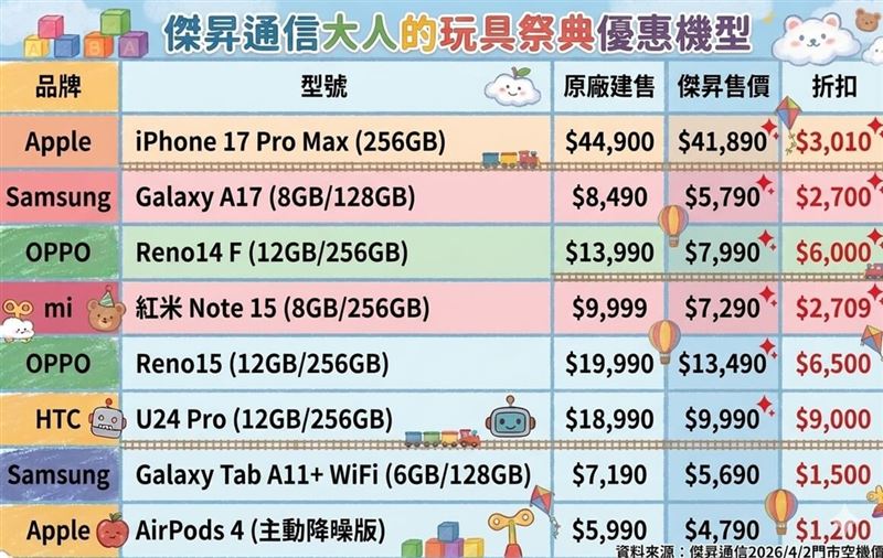 今年清明與兒童節連假相連,看好連假期間換機潮,傑昇通信響應「幾歲都是兒童」的精神,自即日起至4月6日,特別推出限時五天的「大人的玩具祭典」,優惠範圍不僅鎖定最新的iPhone 17e與iPad Air、OPPO Reno15砍6千5、還有免萬元的三星Galaxy A17給出震撼折扣。