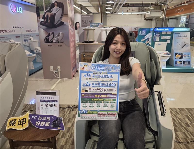 燦坤3C家電也看好連假商機,即日起至4月9日推出「春日同樂會」檔期促銷活動,以「五星級(諧音「有省錢」)」為核心訴求,集結多元3C家電商品,祭出「獨家現折3重奏」,指定品牌商品會員促銷價全館5折起、單品最高再現折2,600元,並可搭配節能補助與汰舊換新方案,最高回饋6,000元,再享全館單筆消費滿4,455元(排除購買Apple、小米系列與Switch 2主機商品,且須事先綁定「TK3C」APP,並於5月11日前出庫),就有機會抽中iQOO 15 電競智慧型手機(市值29,999元,抽1名)、JHT超好窩沙發按摩椅(市值29,800元,抽1名)。