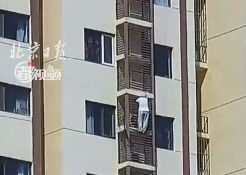 中國北京市石景山一處社區驚見恐怖爬牆畫面,當地一名89歲獨居老婦人因被反鎖房內,竟異想天開從27樓翻牆而出,沿著外牆圍欄一路往下爬,最終因體力不支,受困21樓的圍籬上,幸好警消及時到場救下老婦人,化解墜樓危機。而老婦人如蜘蛛人般爬行畫面曝光後,也在網路上引發熱議。
