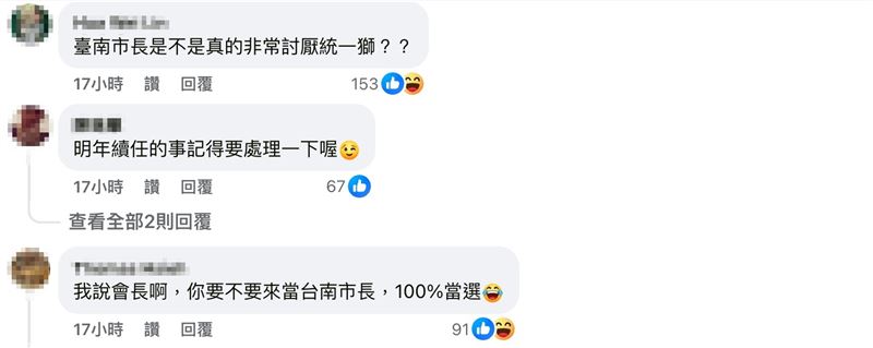 不少球迷看到紛紛留言,「你是電你是光你是唯一的神話」、「我說會長啊,你要不要來當台南市長」、「100%會當選」、「會長,台南人不捨統一球團被欺負」、「下屆來台南選市長一定沒問題」。對於攤商爭議,台南市體育局長陳良乾出面道歉滅火,解釋因租約不含「球場外空間」,基於採購程序必須上網公開招商,才導致此次溝通落差與誤會。