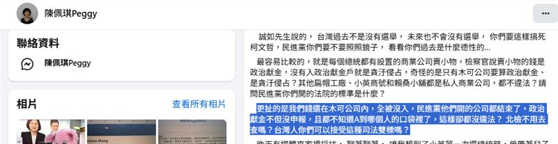 粉專《事實勝於雄辯》表示「陳佩琪承認木可應沒收的6134萬6790元是他家的嗎?負責人不是李文娟」,他也質疑陳佩琪到底為什麼會覺得大家都跟他們一樣?他舉例表示民進黨是找行銷公司為宣傳,柯文哲是找人掛名開公司為了錢,最後還玩哏直喊「賴祥德,還我6千萬」。