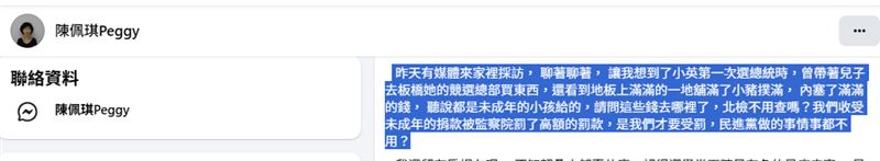 陳佩琪質疑「北檢不用查嗎?我們收受未成年的捐款被監察院罰了高額的罰款,是我們才要受罰,民進黨做的事情都不用」,直球抨擊北檢雙標,一名當年身為三隻小豬活動助手的網友發聲直言「你確定要問」?