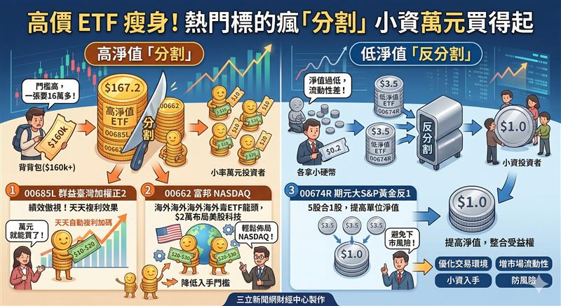 與此同時,也有部分淨值過低的槓桿反向標的如「期元大S&P黃金反1(00674R)」,則採取相反的「反分割」策略來整合受益權單位,顯示出ETF市場正透過價格重整,積極優化交易環境。