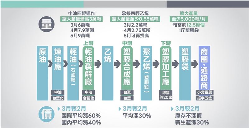 在產業部分,鄒宇新指出,三個關鍵是乙烯、聚乙烯跟塑膠袋。首先「乙烯」部分,可以看到中油4月1日增加產能後,4月份可以增加1.9萬噸,5月擴充到3萬噸,上游乙烯可以穩定供應;聚乙烯部分,過去2.2萬噸是穩定供應國內內需,未來會有額外供應,可以達到2.75萬噸的量,可以穩定供應下游塑膠業的需求。