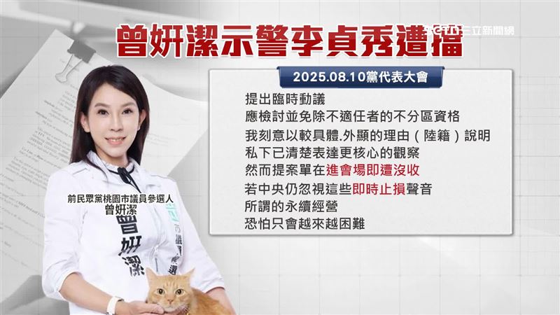 曾妍潔指出,自己曾在2025年黨代表大會提臨時動議,檢討並免除不適任者的不分區資格,但提案單「進會場就遭沒收」,讓他直呼若黨中央忽視諫言,想永續經營恐怕越來越難。