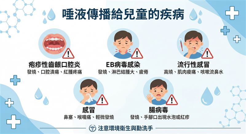 其中疱疹性齒齦炎潛伏期約7天,症狀包括發高燒、口腔周圍起紅疹、口內起水泡、流口水,嚴重者舌頭和嘴唇周圍會潰爛;EB病毒則主要經由唾液和飛沫傳染,少數幼童會發燒、喉嚨痛、嚴重時扁桃腺化膿腫脹;流感和一般感冒都可能在共食時藉由口腔飛沫進入呼吸道,嚴重者分別可能併發肺炎、腦炎和心肌炎;腸病毒則是兒童常見疾病,症狀包括口腔潰瘍、發燒、手掌腳掌起疹子,透過腸胃道和呼吸道均可傳染。