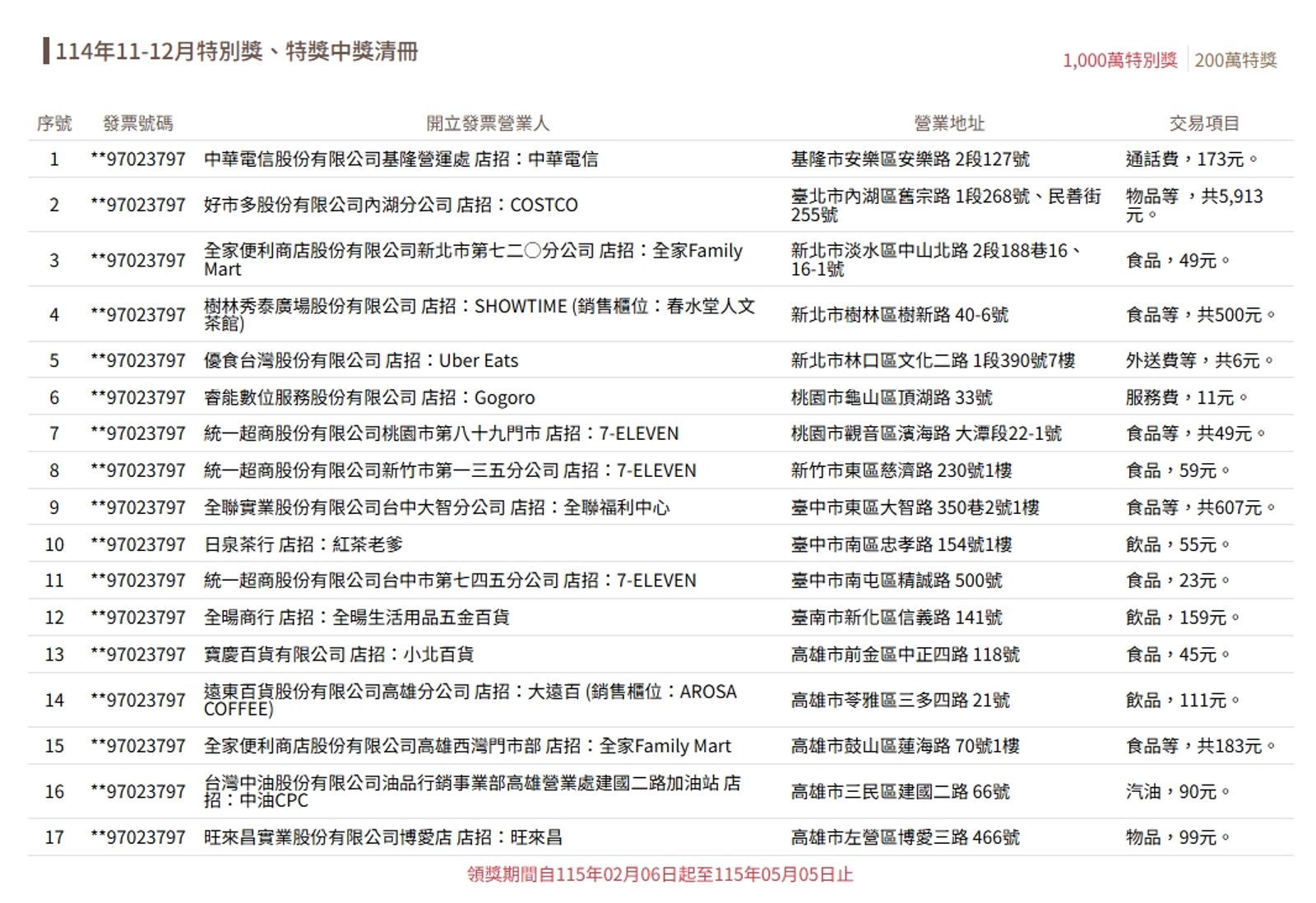 2025年11、12月特別獎幸運兒,包含統一超商3張、全家便利商店2張,全聯、春水堂、Uber Eats、小北百貨等各1張。隨著領獎期限倒數不到1個月,仍有6名特別獎幸運兒未領取,包含全聯、全家、好市多、中華電信、春水堂、Gogoro。