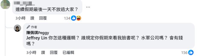 不過也有網友批評,「妳安靜一點比較好」、「閉嘴那麼難嗎?懷疑你的EQ」、「妳真的很閒」、「講那麼多成就,然後貪污」、「木可給阿堯買股票的兩百多萬說清楚了嗎,一家都是貪」、「為什麼你問題那麼多」、「越描越黑」;還有網友問「連續假期最後一天不放過大家?」,陳佩琪對此回應「你怎這種邏輯?誰規定你假期來看我臉書呢?水軍公司嗎?會有錢嗎?」。