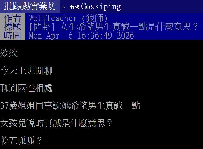 近年來「男女交往、兩性相處、真誠交往」的討論在網路論壇上屢屢掀起話題。一名網友在PTT的Gossiping板上,以「女生希望男生真誠一點是什麼意思?」為題發文,描述自己37歲的女性同事在閒聊中感嘆,希望異性在相處時能「真誠一點」。貼文曝光後,立刻引發大批鄉民熱議,不少留言更把話題歪樓到「財力與資產」,讓整串討論充滿各種幽默吐槽。