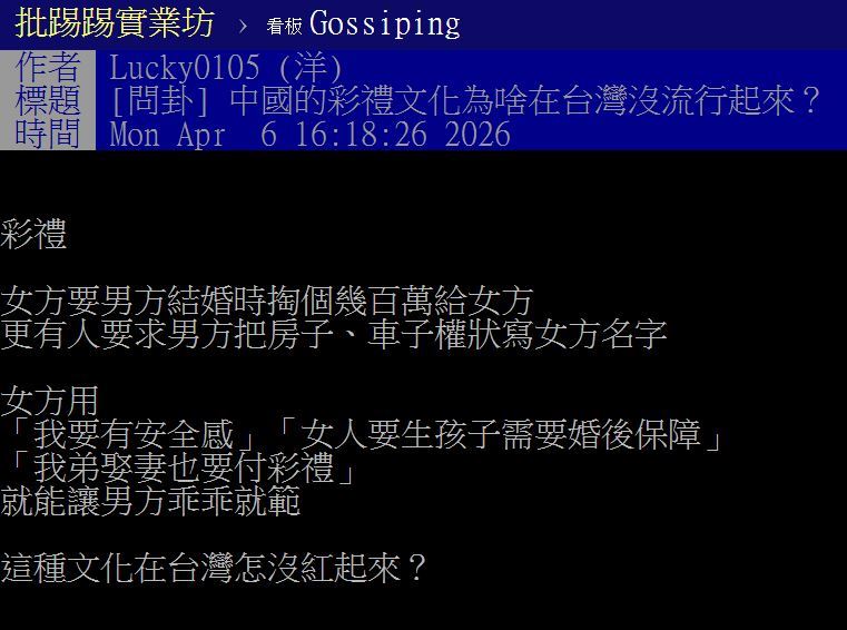 【PTT提問:中國彩禮為何台灣不流行】原PO在貼文中指出,在中國部分地區,結婚時常見「彩禮」文化,男方必須拿出數十萬甚至上百萬給女方家庭,有些還會要求房子、車子登記在女方名下。