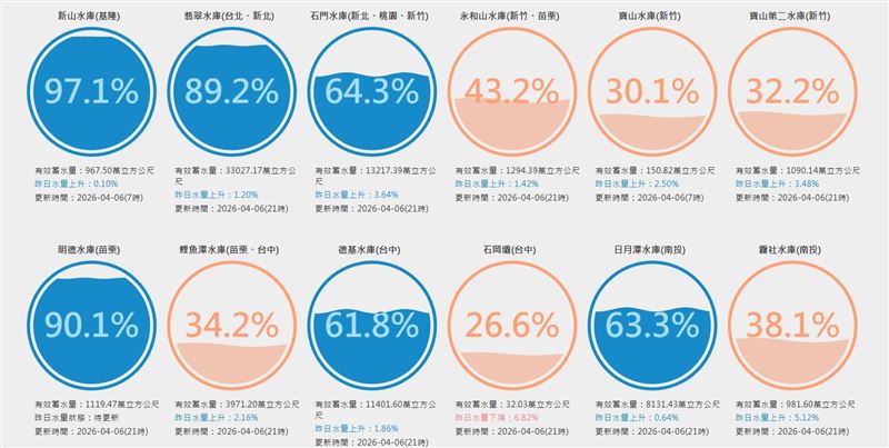 清明連假遇上今年最強春雨,全台多處淹水成災,苗栗更一度包辦全台雨量前30名,不過這波強勁春雨,卻替全台水庫帶來及時甘霖。這波降雨已為全台水庫挹注約1.5億噸水量,石門水庫更是「大進補」,蓄水率從拉警報的5成左右,截至6日晚間蓄水率回升至64.3%。