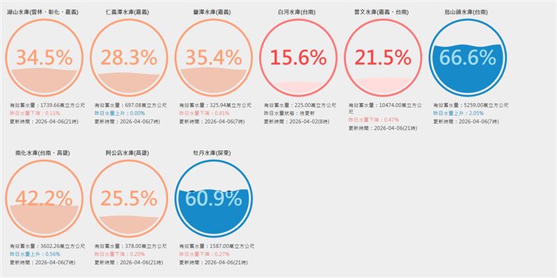 國內規模最大的曾文水庫,蓄水率21.5%,阿公店水庫約25.5%,仍屬偏低水位。仁義潭水庫約28.3%、蘭潭水庫35.4%、南化水庫則是42.2%。