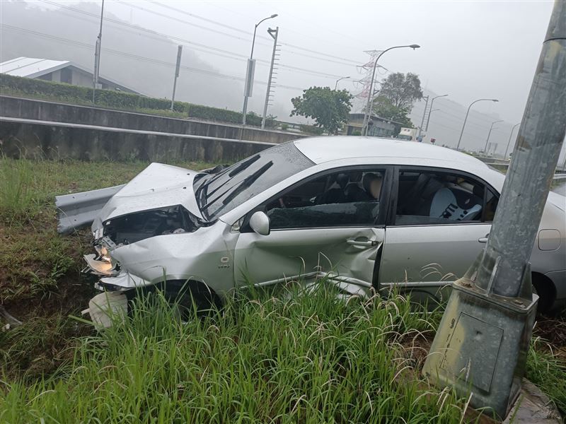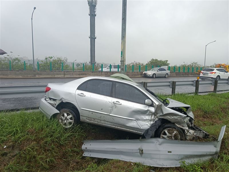 今日下午3時20分,62歲洪女駕駛轎車行駛於國道6號西向6.7公里處內側車道時,因不明原因追撞前方由38歲謝女駕駛的轎車,雙方車輛碰撞後失控,謝女車輛撞破路邊護欄、衝下邊坡,受困在草地上,車頭鈑金也因此受損,嚴重凹陷。
