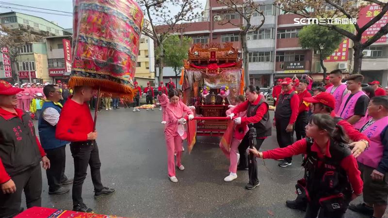 桃園龍德宮四媽祖,從4日開始,展開九天八夜的南巡徒步遶境活動,在昨(6)日時,鑾轎隊伍抵達豐原,信眾熱情歡迎。值得一提的是,四媽祖的鑾轎,負責扶轎的轎班成員清一色都是女性,也成為這場宗教盛事的一大特色。