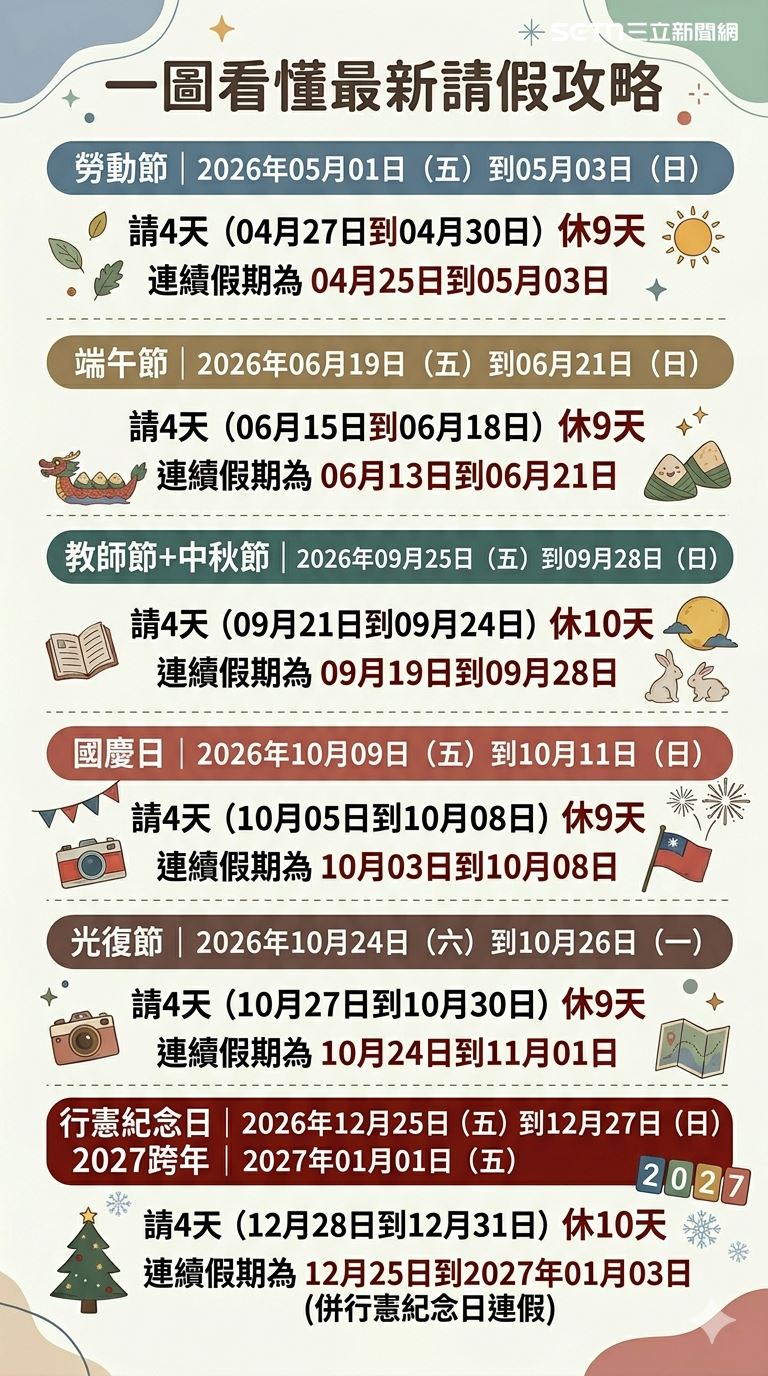 台灣新聞通訊社-2026連假剩6個!最強請假攻略曝光 2大假期「請4爽休10天」