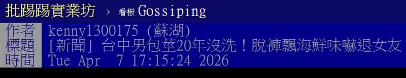 【PTT網友熱議 有人直呼「隔著螢幕都臭」】一名網友特別在PTT的Gossiping板上,以「台中男包莖20年沒洗!脫褲飄海鮮味嚇退女友 再拖恐陰莖癌」為題發文,詢問網友看法,貼文在PTT曝光後引來大量鄉民留言,不少人驚呼:「光看文字敘述就覺得很臭」、「20年也太誇張」、「這樣自己洗澡不會發現嗎?」也有人半開玩笑表示「味道隔著螢幕飄出來了」。