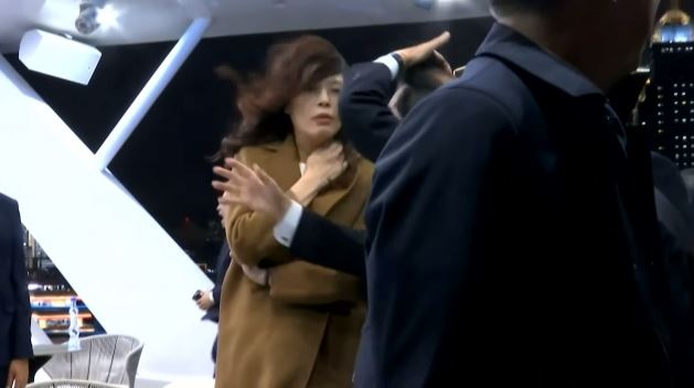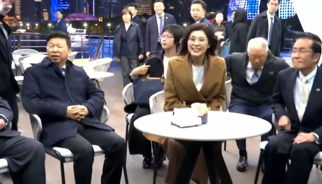 鄭麗文一行人遊黃浦江,宋濤全程陪同。除了在休息室內對談外,一行人也到了船邊,以上海夜景為背景拍照。不過現場風勢有些「失控」,吹亂了鄭麗文的一頭長髮,拍照過程中,鄭頻頻伸手壓住頭髮。不知道是不是吹得有涼,鄭麗文也拉起了咖啡色的套裝外套,表情一度猙獰。不過多數時間,仍然擠出笑容對應,全場氣氛歡愉。