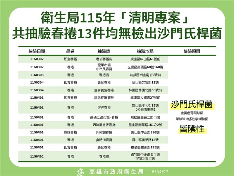 對此,衛生局回擊,兒童清明專案抽檢係涵蓋兒童節餅乾糖果及清明應景春捲等相關食材,3月27日新聞稿發布時已完成檢驗共41件。此外於新聞稿發布後,4月1日及2日再加強抽檢春捲共8件,總計本專案檢驗共49件,其中春捲共13件,抽驗地點涵蓋全市11個行政區,均依衛生標準檢驗沙門氏桿菌、金黃色葡萄球菌、李斯特菌等項目,檢驗結果均合格,與所稱「完全未檢驗沙門氏菌」並非事實。