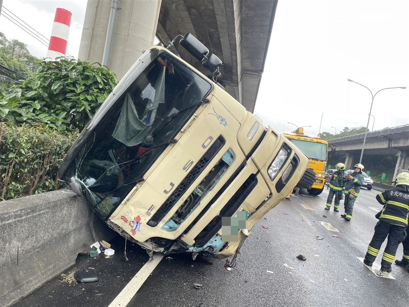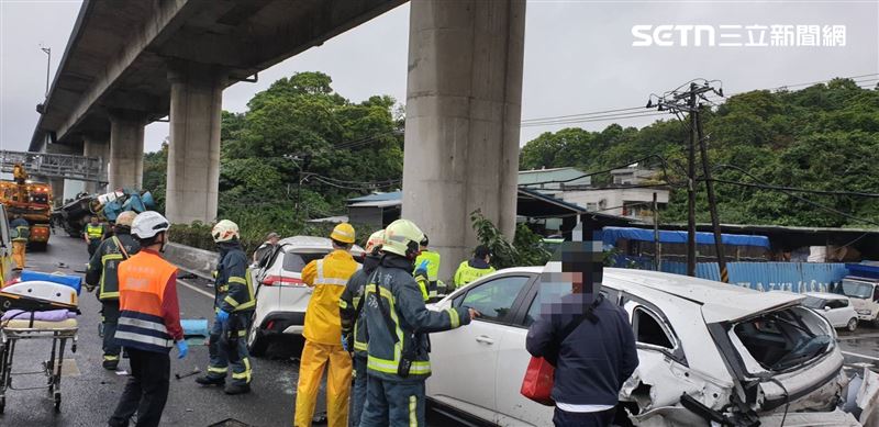 台北市消防局表示,昨天下午2時45分,勤務中心接獲報案,指出國道一號北上15公里發生連環車禍,隨即派遣13車、32人趕赴現場,警消到場時發現,1部水泥預拌車與1部小貨車及4部轎車撞擊後翻覆。