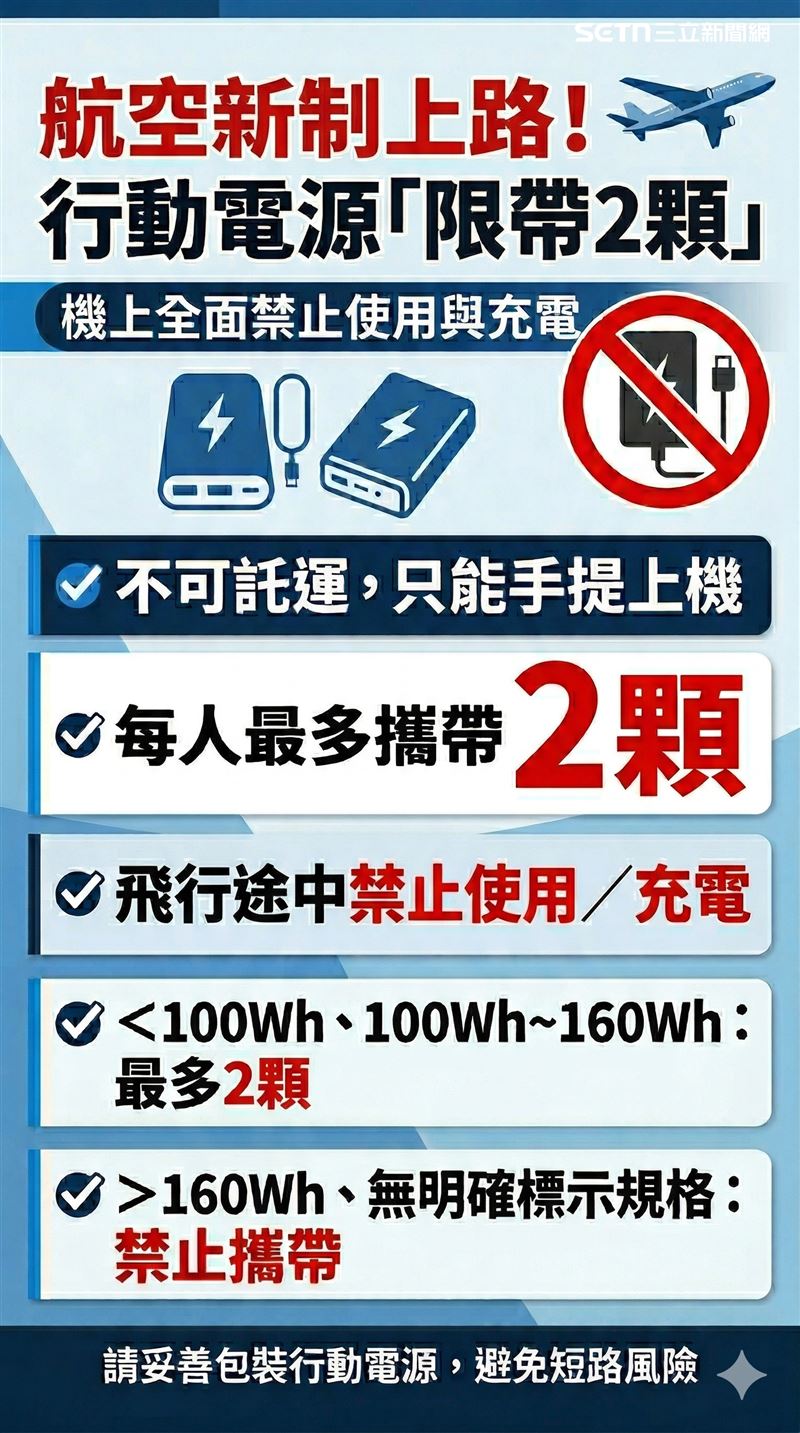 搭機旅客注意!航空新制今(8)日正式上路,因應國際民航組織(ICAO)針對鋰電池行動電源發布新規範,交通部民用航空局宣布,全面實施每位旅客攜帶行動電源數量限制為2顆,並禁止旅客在飛行途中充電,違者最高可罰10萬元。