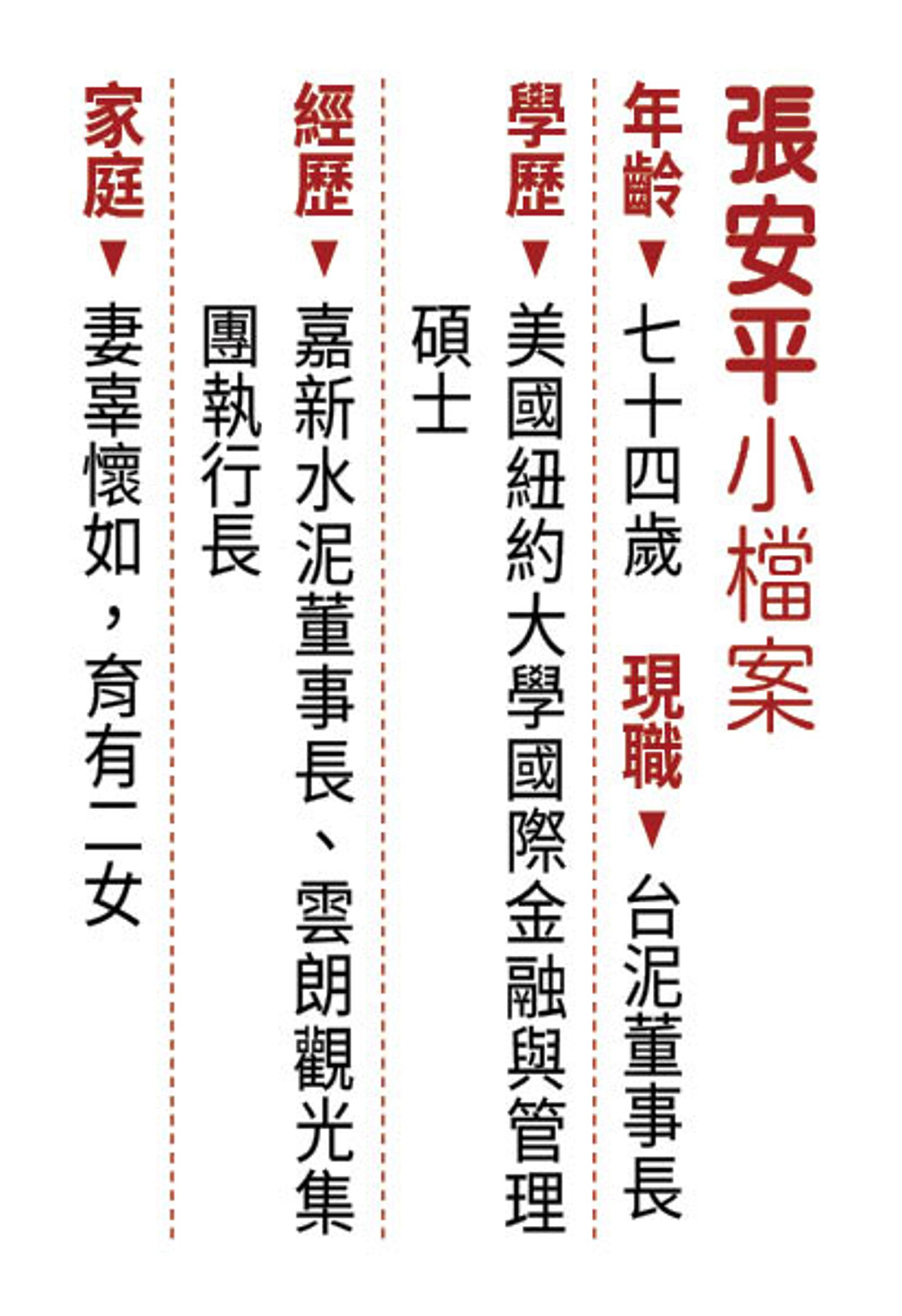 今年74歲的張安平,父親是人稱水泥大王的張敏鈺,財務工作出身,曾參與台泥、嘉泥集團內工作,非常了解水泥業。他常說:「經營企業最重要的不是往前衝,而是要避開危險;在決策時最重要的,就是先預想未來可能遭遇的風險,要怎麼避開,不能避開的話要怎麼解決。」正因這高度風險意識,讓他成為台泥的最佳救援投手。
