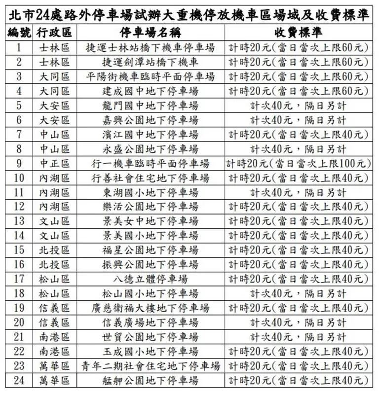 根據了解,台北市自4月6日起展開為期6個月試辦的「機車與大型重型機車共用機車格位」2.0計畫,停管處選定全市24處公有路外停車場,首度採取「雙軌制」收費與停放規範: