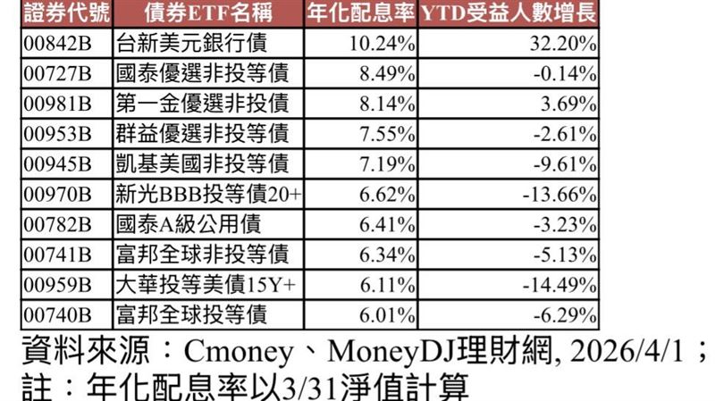 隨美國、以色列及伊朗戰事延續,油價維持高檔、股市陷入震盪之時,全球債市現金仍往投資等級債券湧進。四月份進入債券ETF除息旺季,據目前已公布配息的債券ETF資料顯示,四月份除息之債券ETF年化配息率前十強之配息率皆達6%以上,其中前三強台新美元銀行債(00842B)、國泰優選非投等債(00727B)、第一金優選非投債(00981B)年化配息率皆逾8%,台新美元銀行債(00842B)是唯一年化配息率逾10%,今年來受益人數大增32%表現亮眼。