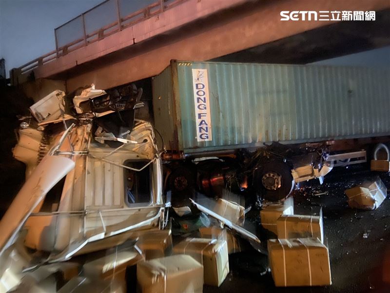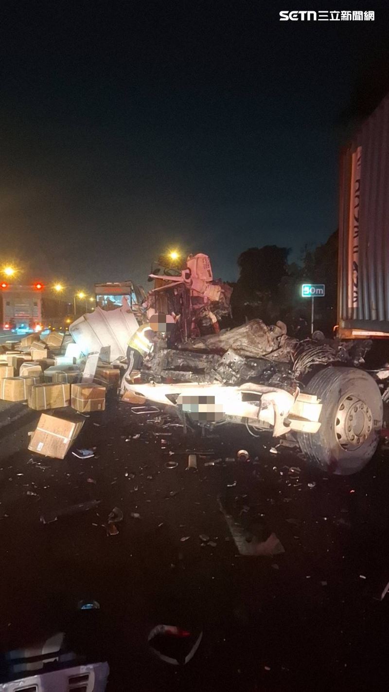台灣新聞通訊社-國道1號岡山段3車連環撞!46歲駕駛疑分心追撞送醫亡 大貨車「斷頭」