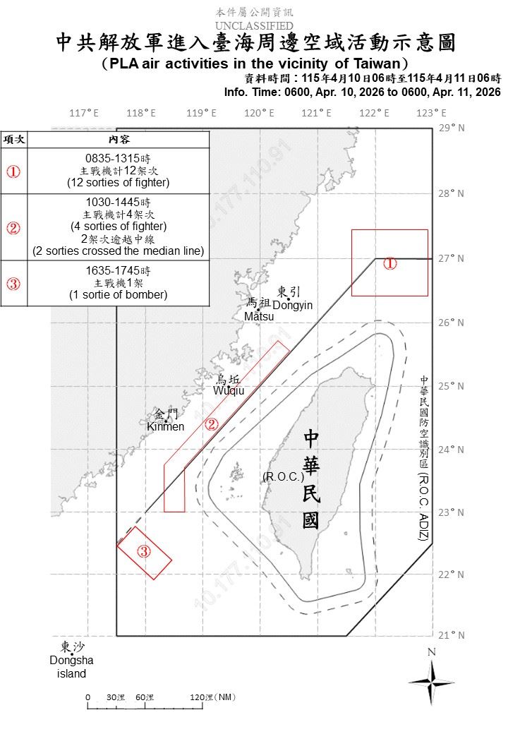 國民黨主席鄭麗文、中共總書記昨(10)日舉行鄭習會,鄭麗文大談和平,還稱兩岸人民雖生活在不同的制度中,但會相互尊重,也要相向而行。然而,國防部今(11)日表示,自10日上午6時至11日上午6時止,偵獲共機17架次,其中15架次逾越中線進入北部及西南空域,還有共艦7艘、公務船1艘,持續在台海周邊活動。