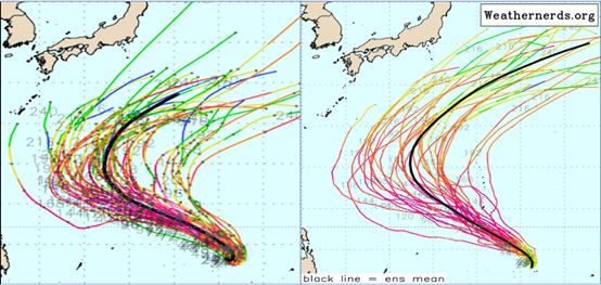 據氣象署最新資料顯示,位在關島東南方的颱風「辛樂克」持續向關島前進,將於13日20時增強至強颱。最新歐(ECMWF)、美(GEFS)系集模式皆模擬,其未來將在日本南方海面「大迴轉」,迴轉位置雖有差異,但皆距臺灣及日本相當遠,不會侵襲台灣。