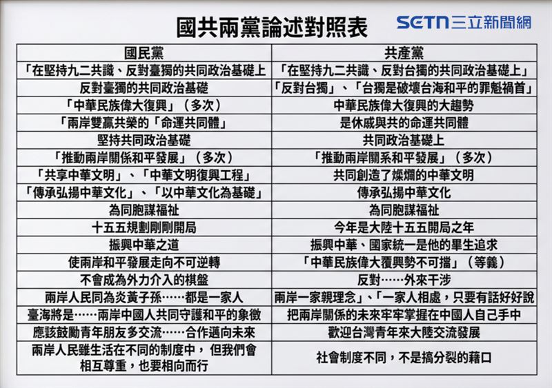 綜觀前述,國安官員表示,這兩份新聞稿在核心論述框架、政治話語體系、價值主張與結構安排上呈現高度協同,遠超一般政黨交流中可預期的「共識範圍」。國民黨大量採用中共官方話語體系,在若干關鍵政治表述上與中共幾乎逐字吻合,顯示兩方在會前存在相當程度的論述協調。在「反台獨」、「九二共識為唯一政治基礎」、「中華民族認同框架」等核心議題上尤為明顯,且國民黨方面更進一步主動採用中共常用的「中華民族偉大復興」、「命運共同體」等政治符號。