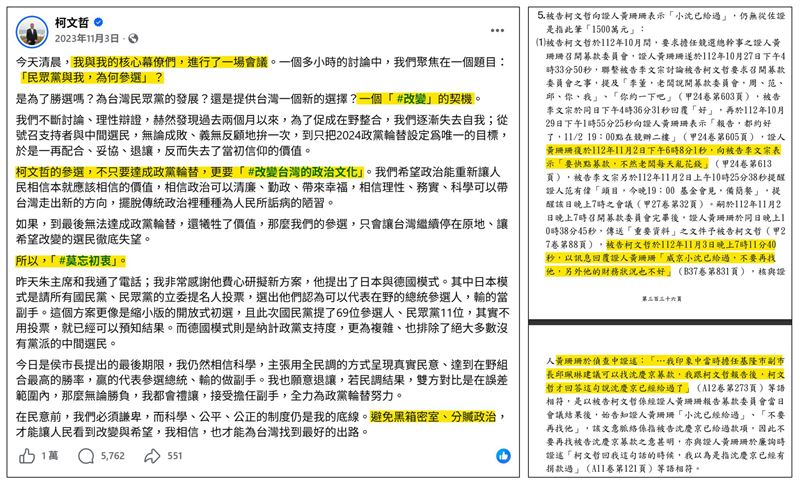 四叉貓文中提到,隨後柯文哲2023年11月3日又在臉書發文,當中就寫下「民眾黨與我,為何要參選?」、「柯文哲參選要改變台灣的政治文化」、「莫忘初衷,避免分贓政治」;以上種種讓四叉貓不禁感嘆「現在回顧去看,整個不勝唏噓,原來柯文哲參選就是為了撈錢,而且柯文哲還每天亂花錢」。