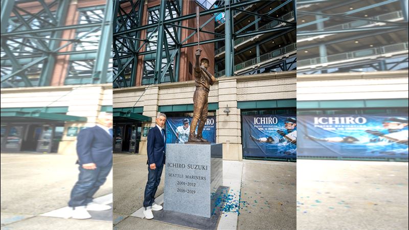 11日水手正式公開傳奇球星鈴木一朗的雕像,沒想到原本應該呈現左打外野手經典揮棒姿勢的青銅球棒,竟在揭幕瞬間握把處斷裂,鈴木一朗還逗趣表示,一定是洋基隊傳奇終結者李維拉(Mariano Rivera)幹的。