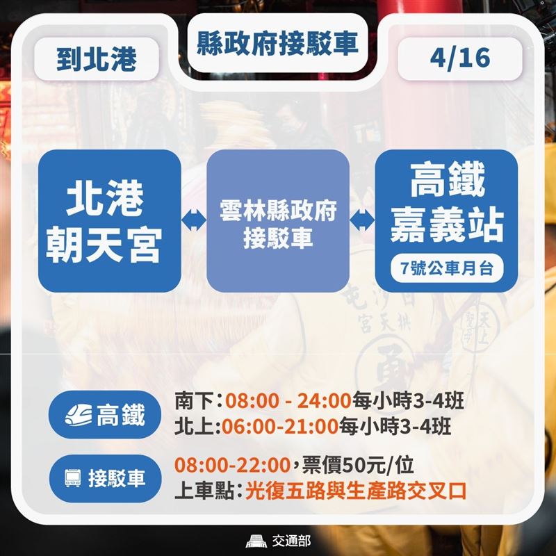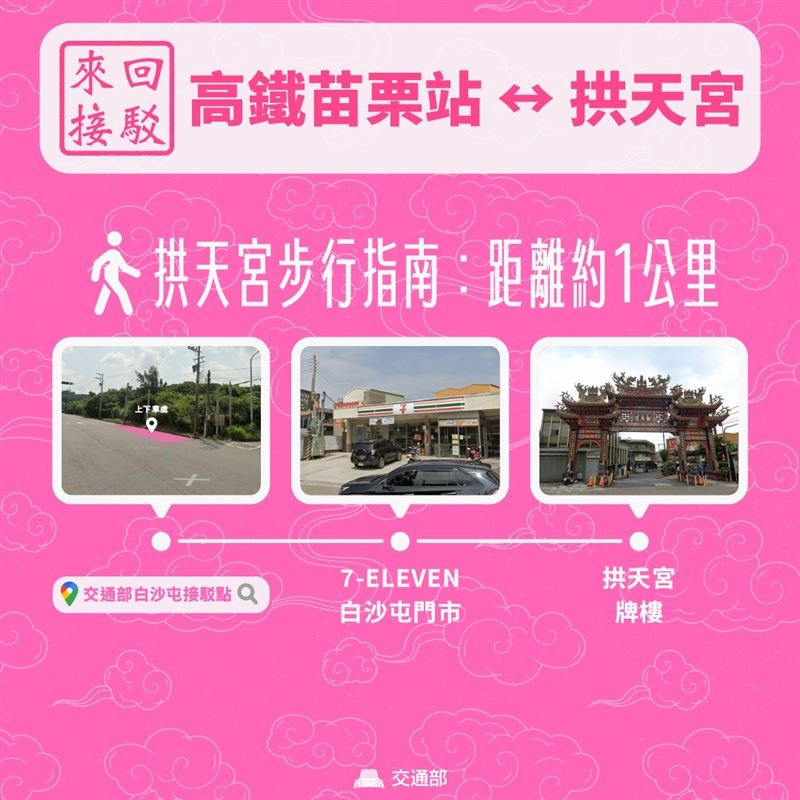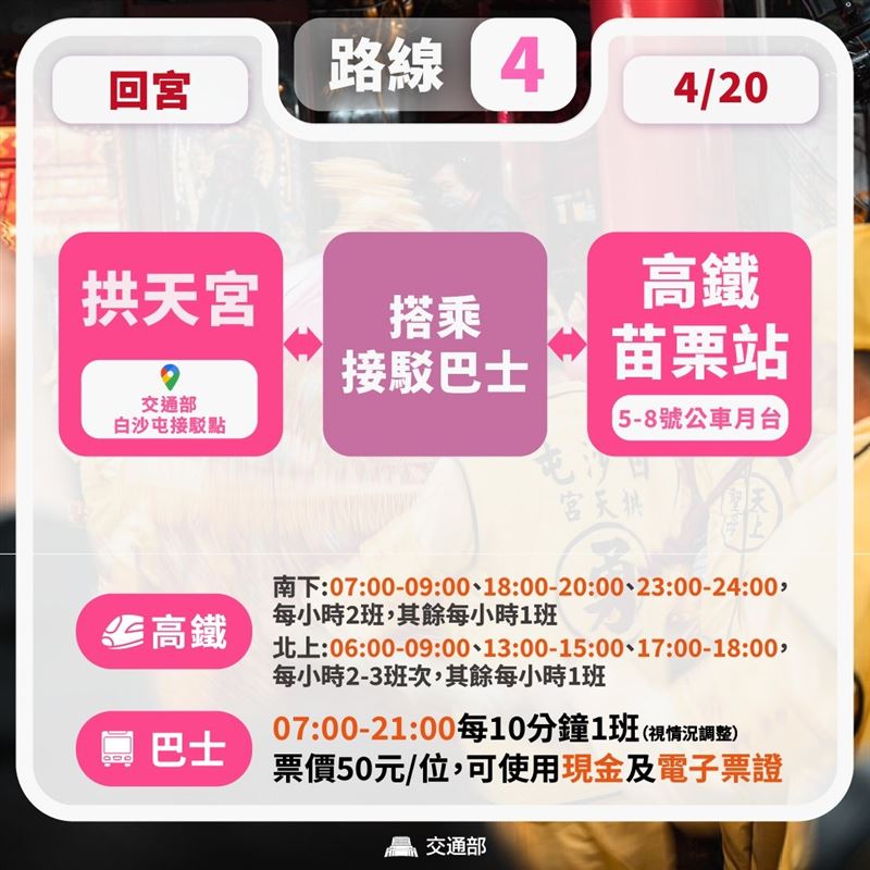 2026年白沙屯媽祖進香人數突破46萬大關,將於12日深夜起駕,展開8天7夜的徒步行程,信徒與「香燈腳」紛紛湧入苗栗通霄,對此,交通部鐵公路運輸也增加班次,搭乘高鐵到苗栗站,可搭乘接駁車前往拱天宮;搭乘台鐵到白沙屯站,步行約900公尺就可抵達拱天宮。交通部也提供4種路線,方便民眾前往,以及返程也可搭乘接駁車,以下為大家公布時間地點。