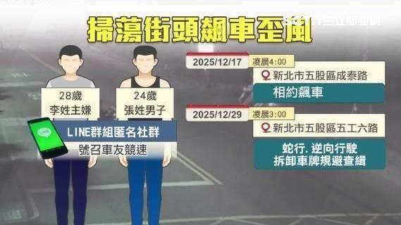 回顧事發經過警方調查發現,28歲李姓主嫌與24歲張姓男子透過LINE群組,建立匿名社群號召車友深夜聚集競速,去年12月17日凌晨4點多,一行人就在五股區成泰路相約飆車,同月29日又再度號召車友轉往五工六路競速,過程中不只高速併行還蛇行逆向行駛,甚至拆卸車牌規避查緝行徑相當囂張,警方在上個月30日掌握相關事證,一舉將涉案嫌犯查緝到案。