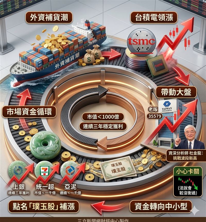 台積電法說會前流量密碼 璞玉指數成中小型股避風港杜金龍點出,目前市場有一股神祕力量正轉向中小型股,他特別提到交易所積極推廣的「璞玉指數」(普益指數)。這個指數篩選了50名到150名、市值一千億以下且連續三年穩定獲利的「低調強勢股」。杜金龍強調,在陌生段行情中,很多主升段沒漲到的冷門股會「還你公道」。目前像是上銀、統一超、甚至部分傳產股如亞泥、環泥,都已經被納入這個選股搖籃。