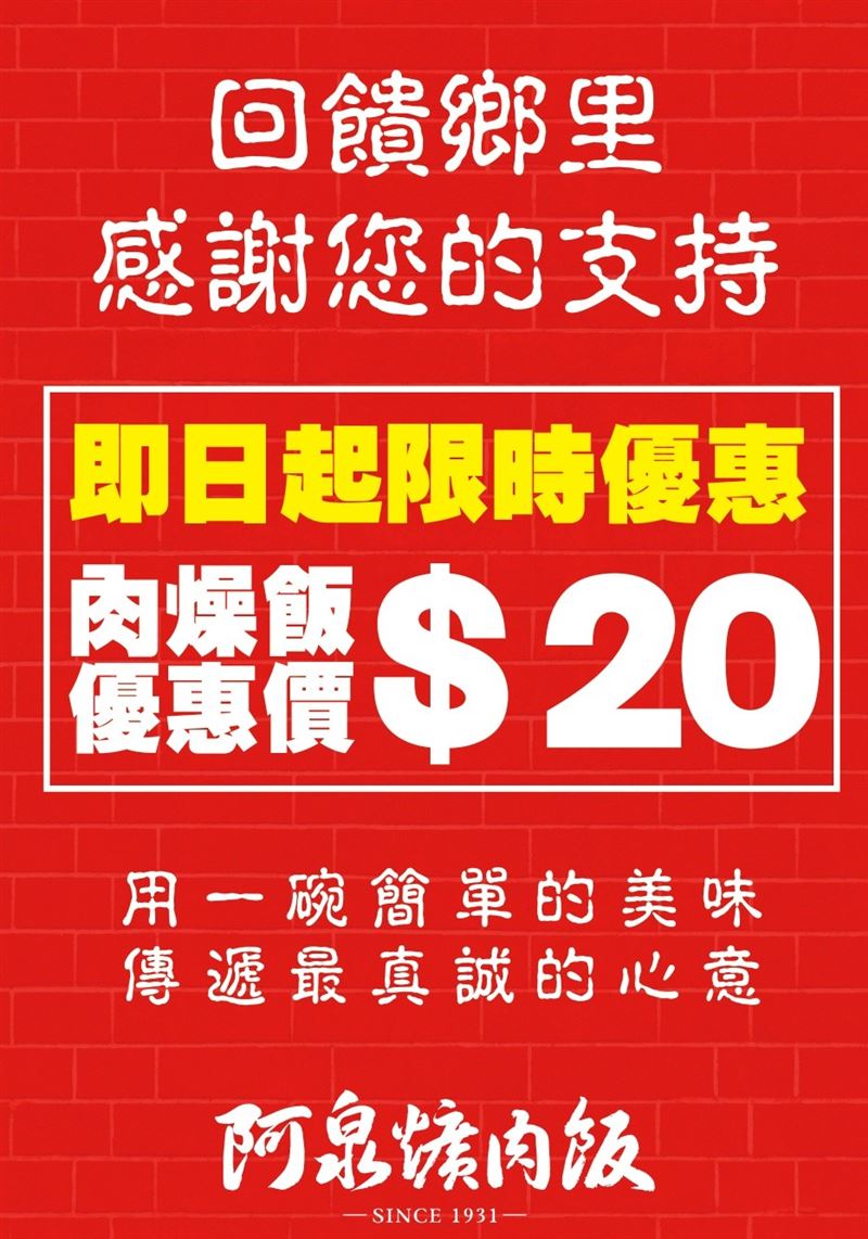阿泉爌肉飯昨(12)日在臉書粉專發文表示,為了感謝大家一路以來的照顧與支持,特別推出限時優惠活動,肉燥飯每碗只要20元,「這不是促銷,而是我們的一點心意」。