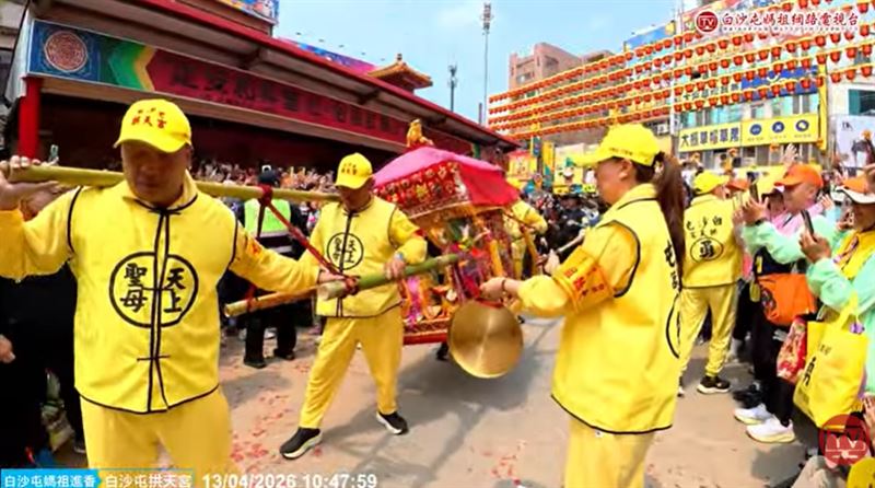 一年一度白沙屯拱天宮媽祖前往北港進香,昨(12)日深夜11時55分正式登轎啟程。「粉紅超跑」一路狂飆趕路,經過多個信徒設置的休息站,都未停留,今(13)日上午9點多進入台中市大甲區,稍早在永信藥品短暫停駕15分鐘又啟程,接著進入文昌國小,讓小朋友鑽轎腳獲得庇佑。鑾轎最後以小跑步的方式,直衝甩尾大甲鎮瀾宮,鎮瀾宮董事長顏清標也來接駕,罕見的「4媽會」相見歡,引起大批信徒大聲歡呼。