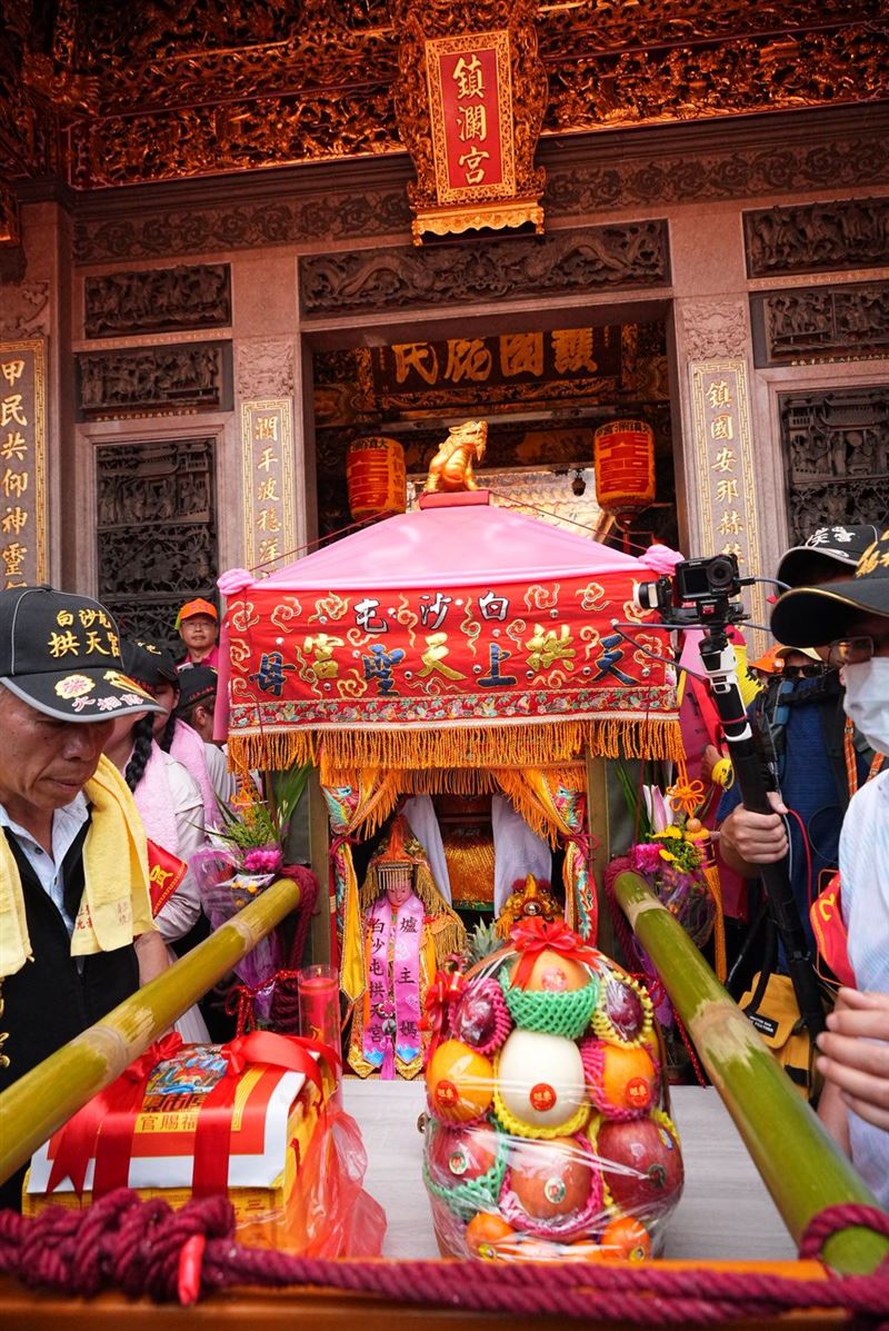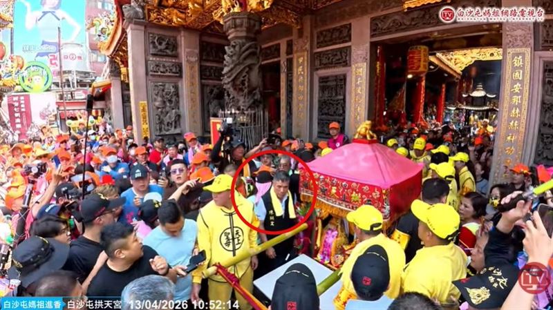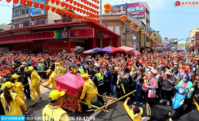 一年一度白沙屯拱天宮媽祖前往北港進香,昨(12)日深夜11時55分正式登轎啟程。「粉紅超跑」一路狂飆趕路,今(13)日上午9點多進入台中市大甲區,先進入永信藥品再到文昌國小,鑾轎最後以小跑步的方式,直衝大甲鎮瀾宮,在門口左轉時,疑似鑾轎劇烈晃動,一名轎班人員不慎被離心力甩出去慘摔,配戴紅臂章的拱天宮委員陳弼宏為了及時扶起轎班人員也跌倒,幸好鑾轎安然無恙,順利進入大甲鎮瀾宮停駕,「4媽會」相見歡。