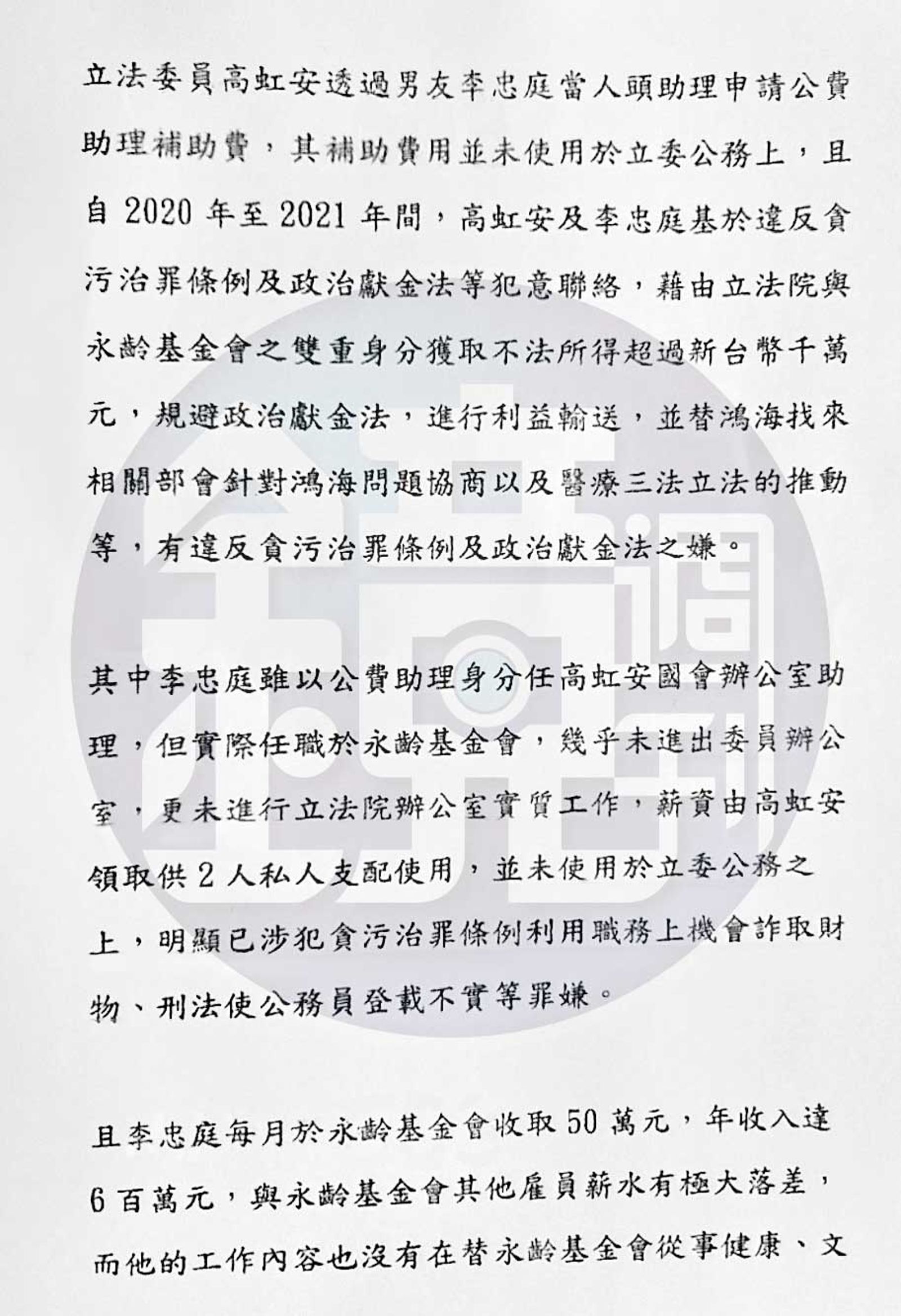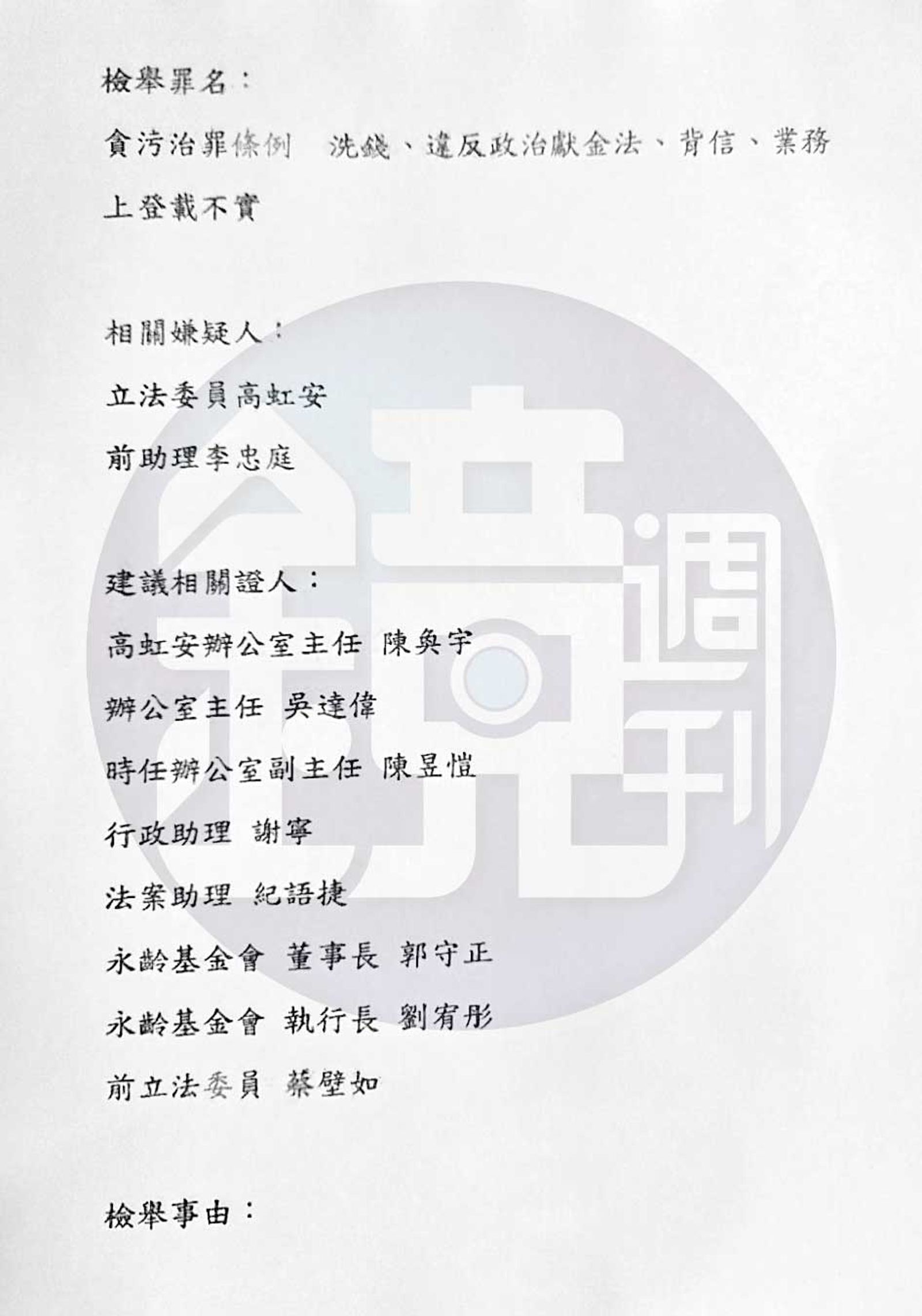 而該檢舉函內,李指控高及其男友李忠庭是涉犯「《貪污治罪條例》、洗錢、違反《政治獻金法》、背信、業務上登載不實」的「相關嫌疑人」,函內還羅列「建議相關證人」,包括曾任高辦主任的陳奐宇及吳達偉、時任高辦副主任陳昱愷及行政助理謝寧、紀語捷,甚至還有永齡基金會董事長郭守正、執行長劉宥彤以及民眾黨前立委蔡壁如。
