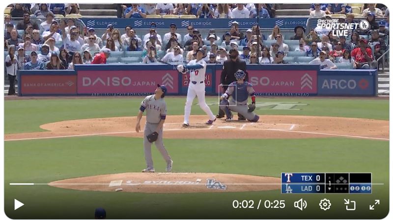 大谷12日首打席就棒打遊騎兵先發投手萊特(Jack Leiter),13日對決生涯首度碰頭的狄格隆,不料狄格隆面投出本場的第一球就失投,98英里的四縫線速球跑到紅中,被大谷逮中以108.3英里的擊球初速掃上右外野看台,本季第5支全壘打出爐,也把連續上壘場數推進到46場。
