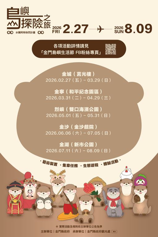 觀光IP超吸睛!金門縣政府推出「水獺阿特快閃:島嶼探險之旅」,以金門特有保育動物歐亞水獺為靈感,打造觀光代言角色「阿特」,並結合五鄉鎮特色設計多款限定造型。採五鄉鎮接力輪展形式,持續至8月9日,邀請旅客走訪金門,感受在地文化與自然生態之美。
