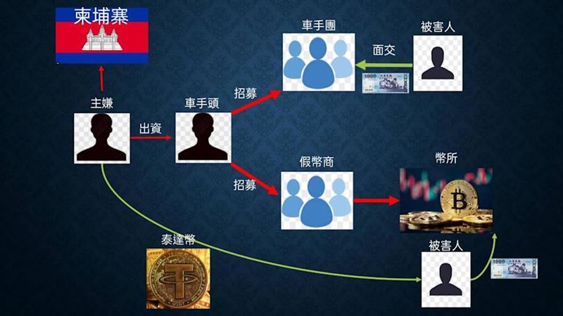 專案小組查出,境外機房先以話術誘騙被害人至指定實體門市交付現金購買泰達幣,羅男等人再將持有的虛擬貨幣打入被害人電子錢包製造合法交易假象;隨後機房再誘使被害人將虛擬貨幣轉入首腦的電子錢包,藉此製造金流斷點。直到被害人想取回投資款項遭拒,才驚覺受騙。經清查受害者達20多人,財損逾新台幣上千萬元。