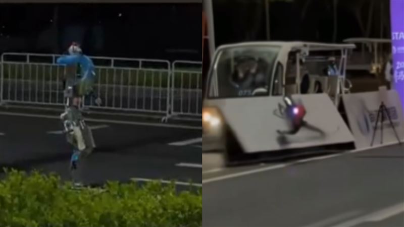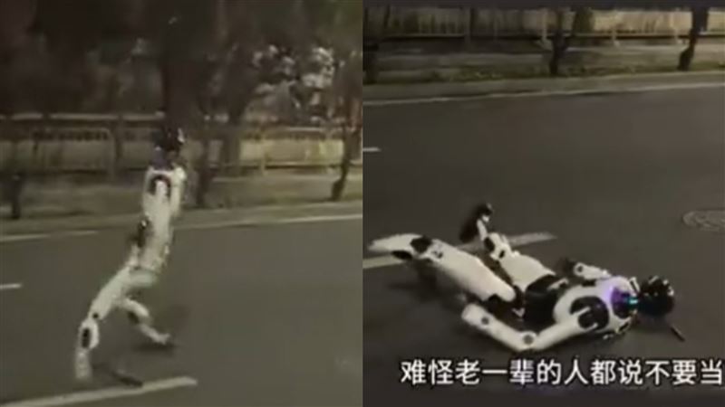畫面中可見,許多機器人在行進過程中突然失去平衡,慘摔在地;有的則是動作嚴重卡頓,宛如當機般原地定格;更誇張的是,還有機器人疑似系統異常,在奔跑中瘋狂抽搐、直直撞牆,甚至傳出零件當場爆炸並伴隨火花噴射的驚悚畫面。