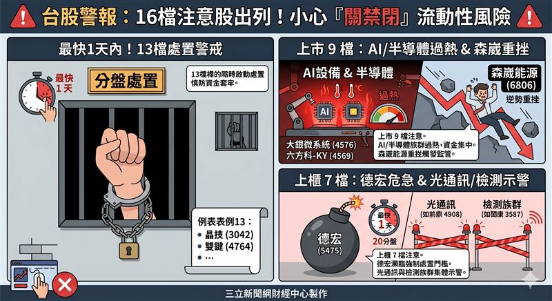 導覽目錄: 最快1天內!13檔面臨分盤處置警戒 上市 9 檔:AI 設備族群過熱 森崴能源逆勢重挫 上櫃7檔!德宏瀕臨強制處置 光通訊與檢測族群集體示警 投資風險提示!慎防「禁閉室」流動性風險