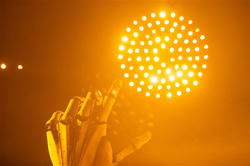 在沒有真人演員的表演下,舞台上的主角化為「光球」與兩隻「機械手」。團隊透過極度精密的動作設計,讓一顆光球的移動具備演員的呼吸感,讓機械手臂的動作展露角色的性格。同時,作品亦運用了大量的尖端影像科技,包含4DGS(Gaussian Splatting)技術,精準整合實體光球與虛擬影子的空間呈現,進一步打破視覺邊界。最大的挑戰是讓科技隱形,讓情感浮現,讓觀眾忘記舞台上沒有人,卻感覺到滿滿的生命力。